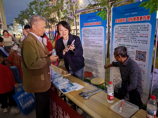 晚上18:30,“美在社区”文明公益活动正式开始。客服部工作人员在九真四路口设摊咨询,为市民提供供水政策、业务征询。面对居民提出的用水疑问,工作人员从水费缴纳细节到用水设施维护都进行了专业解答,同时,还向居民发放用水知识手册,普及节约用水、科学用水小贴士,助力居民养成良好用水习惯。